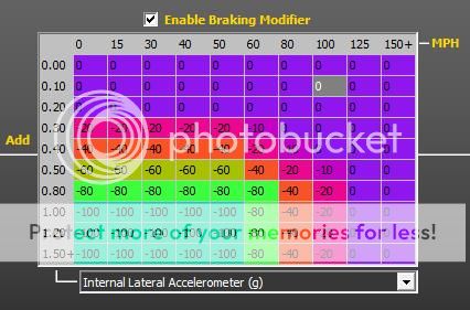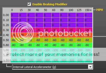 The braking section allows mapping of the DCCD lock based on four parameters: The foot brake being activated, TPS, vehicle speed and a sensor input. Like for the throttle section, the sensor inputs available include internal lateral or longitudinal accelerometers or any external sensor.